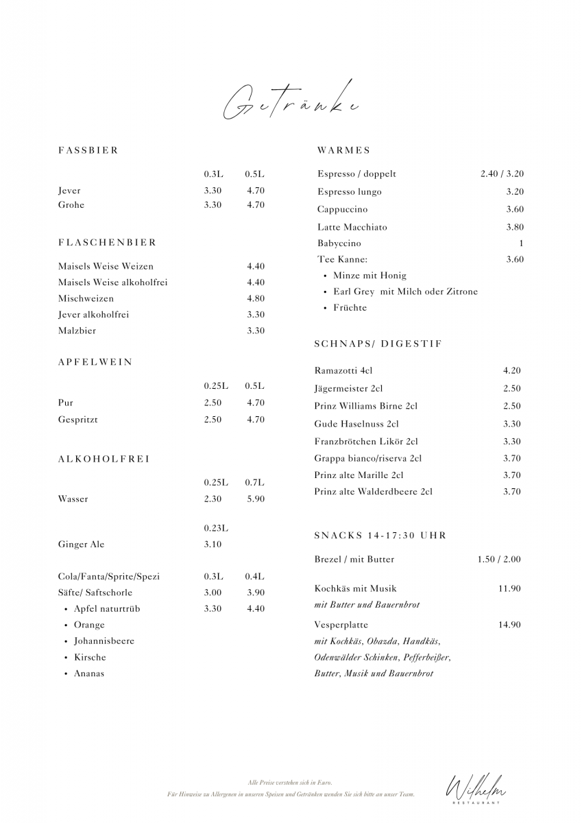 Heute lebt dieser Anspruch weiter: Genießen Sie in unseren stilvollen Innenräumen oder im idyllischen Biergarten unter alten Bäumen eine moderne hessische Küche, die Tradition und Zeitgeist auf den Teller bringt. Frisch, regional und kreativ – mit einem Hauch Geschichte.
