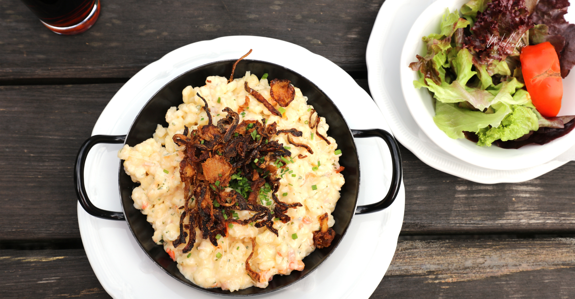mit Bergkäse, Röstzwiebeln und Beilagensalat